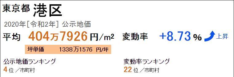 東京都港區的最新公示地價平米單價平均為404萬7926日元/㎡(2020年令和2年),坪單價平均為1338萬1576日元/坪,全國排名第4。從去年開始的變動率為+8.73%,變動率的全國排名是22位。