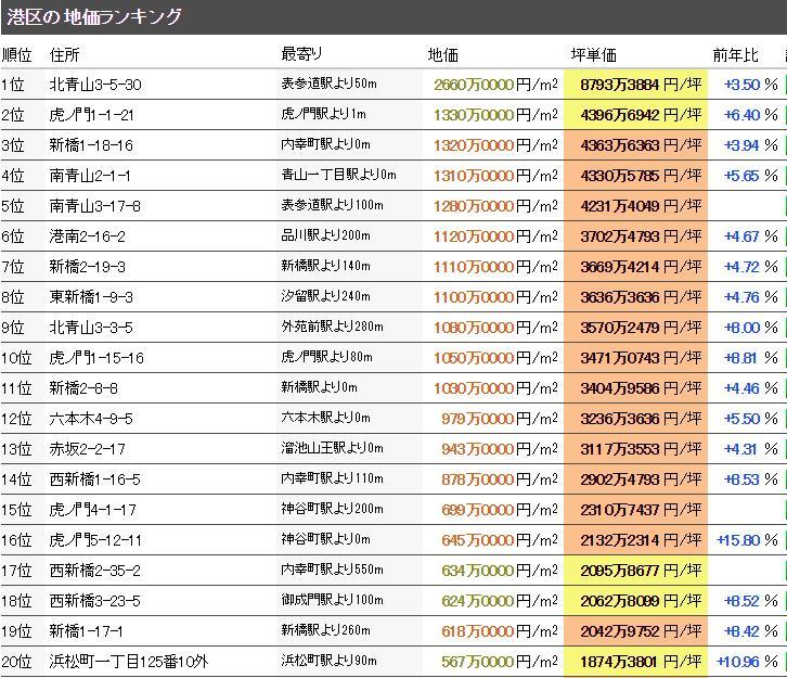 港區內的基準點是東海道新干線、JR山手線、JR東海道本線、JR京浜東北線、京急本線、JR橫須賀線的線路越近地價越高。