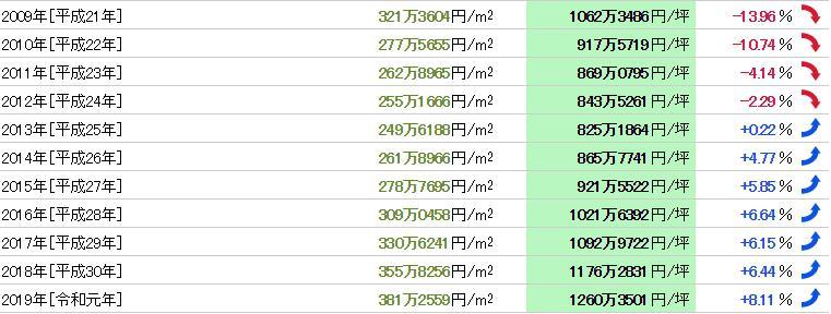 從1985年(昭和60年)開始35年的數據,公示地價的最高值是1119萬2307日元/㎡(1991年),最低值是171萬9322日元/㎡(2000年),兩者的落差是6.51倍。基準地價的最高值是1209萬8888日元/㎡(1988年),最小價格是158萬4565日元/㎡(2004年),兩者的落差是7.64倍。