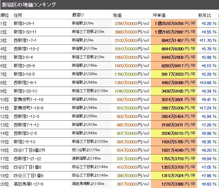 新宿區的最高價格地點是“新宿區新宿3-24-1”(3790萬日元/㎡),最低價格地點是“新宿區上落合3-20-15”(52萬5000日元/㎡)。