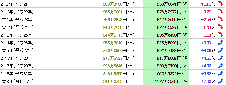 從1983年(昭和58年)開始37年的數據,公示地價最高值是1412萬7142日元/㎡(1989年),最低價格是218萬3452日元/㎡(2004年),兩者的差異是6.47倍。基準地價最高值是1094萬7066日元/㎡(1991年),最低值是216萬3419日元/㎡(2005年),兩者的差異是5.06倍。