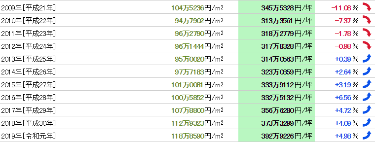 從1983年(昭和58年)開始37年的數據,公示地價的最高值是348萬7777日元/㎡(1988年),最低價格是46萬日元/㎡(1983年),兩者的差異是7.58倍。基準地價的最高值是173萬日元/㎡(1987年),最低價格是46萬日元/㎡(1983年),兩者的差異是3.76倍。