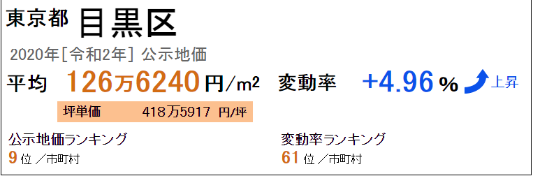 東京都目黑區最新公示地價平米單價平均為126萬6240日元/㎡(2020年“令和2年”),坪單價平均為418萬5917日元/坪,全國排名第9。從去年開始的變動率是+4.96%,變動率的全國排名是61位。