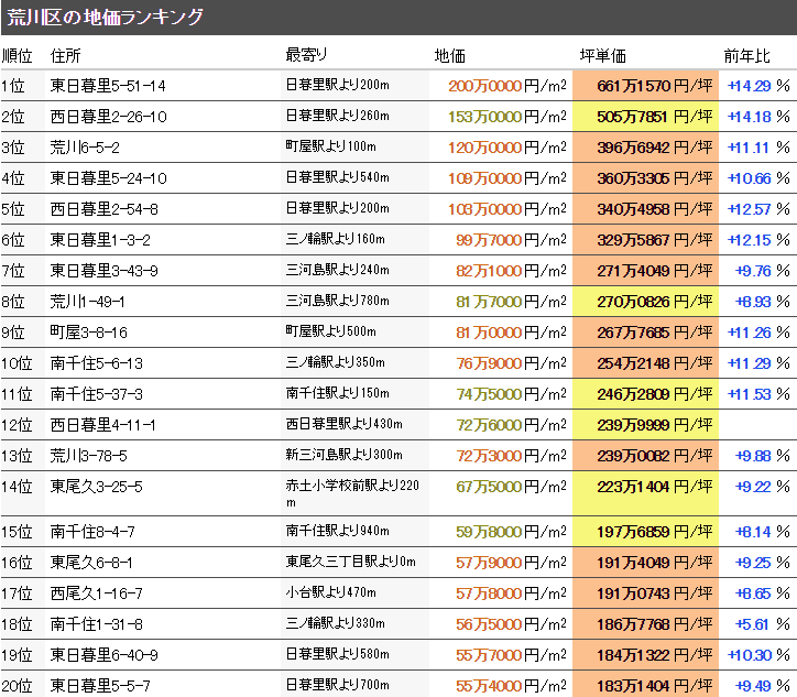 東京都荒川區內基準點的地價,有著距離JR東北本線、JR常磐線、筑波快車、京成本線、JR山手線、JR京浜東北線、日暮里?舍人線越近,土地價格越高的傾向。