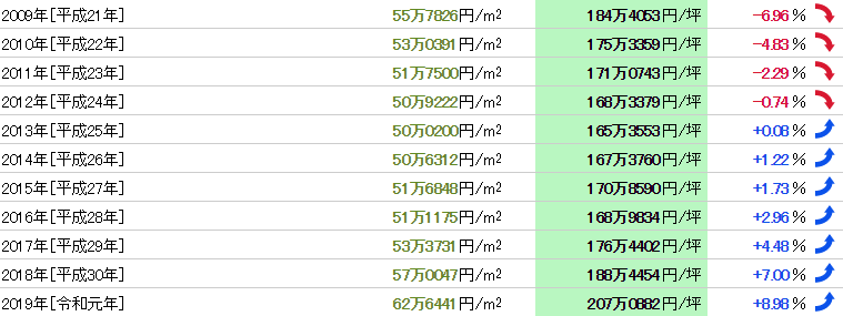 從1983年(昭和58年)開始37年的數據,公示地價的最高值是261萬0000日元/㎡(1988年),最低價格是45萬9882日元/㎡(2005年),兩者的差異是5.68倍。基準地價的最高值是281萬日元/㎡(1991年),最小價格是48萬2600日元/㎡(2005年),兩者的差異是5.82倍。