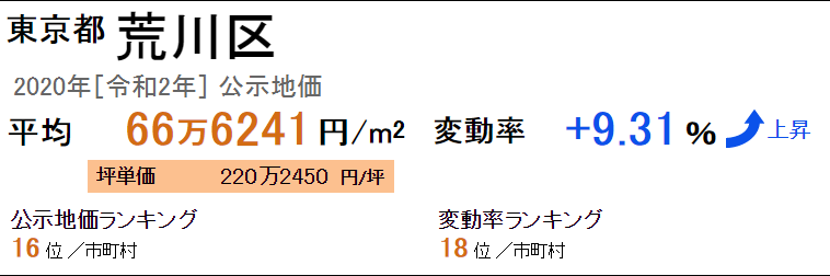 東京都荒川區最新公示地價平米單價平均為66萬6241日元/㎡(2020年“令和2年”),坪單價平均為220萬2450日元/坪,全國排名第16位。從去年開始的變動率是+9.31%,變動率的全國排名是18位。