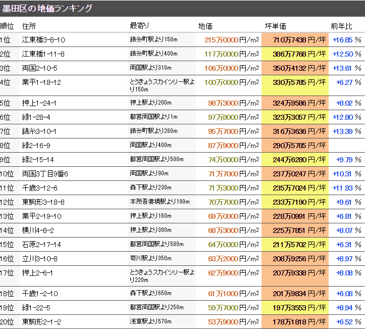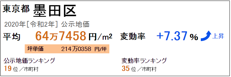東京都墨田區最新基準地價平米單價平均60萬2105日元/㎡(2019年“令和元年”),坪單價平均199萬0430日元/坪,全國排名20位。從去年開始的變動率是+7.68%,變動率的全國排名是29位。