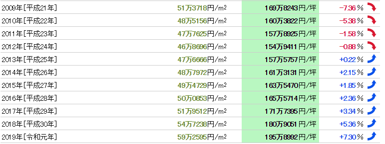 從1983年(昭和58年)開始37年的數據,公示地價的最高值是350萬4000日元/㎡(1990年),最低值是44萬0777日元/㎡(2005年),兩者的落差是7.95倍。基準地價的最高值是278萬6333日元/㎡(1989年),最低價格是41萬7357日元/㎡(2005年),兩者的落差是6.68倍。