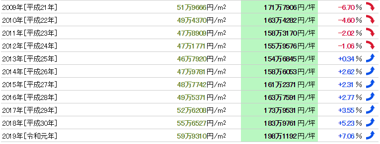 從1983年(昭和58年)開始37年的數據,公示地價的最高值是211萬7272日元/㎡(1990年),最低價格是42萬8038日元/㎡(2005年),兩者的差異是4.95倍。基準地價的最高值是312萬3571日元/㎡(1988年),最小價格是42萬1583日元/㎡(2004年),兩者的差異是7.41倍。