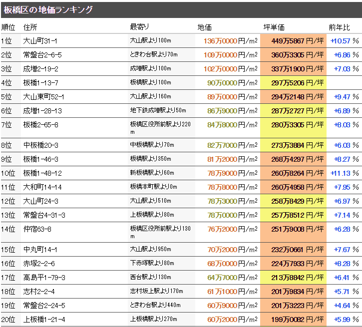 東京都板橋區內的基準點地價,有越靠近JR埼京線、東武東上線、東京地鐵有樂町線的車站,地價越高的趨勢。