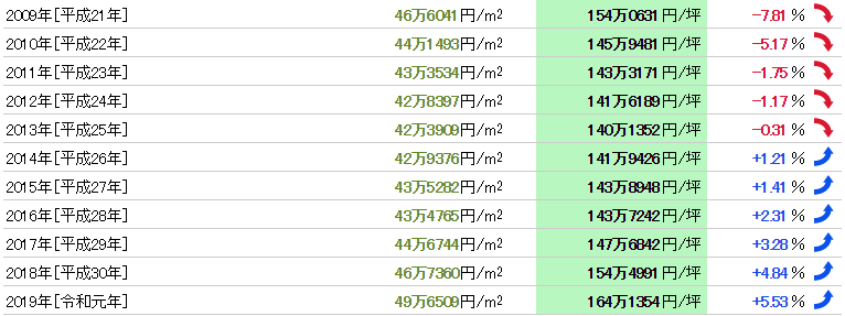 從1983年(昭和58年)開始37年的數據,公示地價的最高值是160萬6411日元/㎡(1989年),最低值是40萬6673日元/㎡(2005年),兩者的落差是3.95倍。基準地價的最高值是122萬4882日元/㎡(1990年),最低值是30萬7000日元/㎡(1983年),兩者的落差是3.99倍。