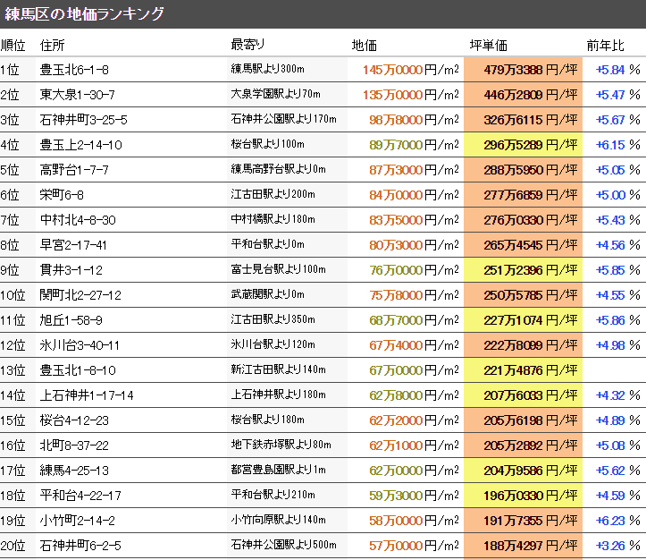 東京都練馬區(qū)的最高土地價格地點是“練馬區(qū)豐玉北6-1-8”(145萬0000日元/㎡),最低土地價格地點是“練馬區(qū)大泉町1-27-13”(22萬6000日元/㎡)。