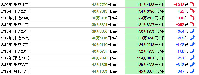 從1983年(昭和58年)開始37年的數(shù)據(jù),公示地價的最高值是112萬4684日元/㎡(1988年),最低價格是35萬1187日元/㎡(1983年),兩者的差異是3.20倍。基準地價的最高值是97萬1857日元/㎡(1990年),最低價格是26萬7200日元/㎡(1983年),兩者的差異是3.64倍。