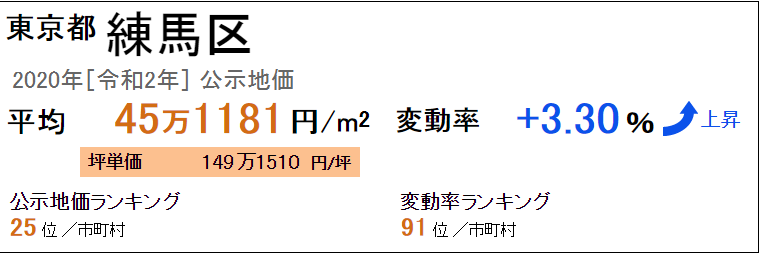 東京都練馬區(qū)最新公示地價平米單價平均為45萬1181日元/㎡(2020年“令和2年”),坪單價平均為149萬1510日元/坪,全國排名第25。從去年開始的變動率是+3.30%,變動率的全國名次是91位。