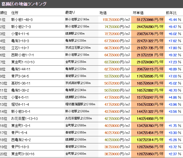 東京都葛飾區的最高土地價格地點是“葛飾區新小巖1-48-3”(155萬0000日元/㎡),最低土地價格地點是“葛飾區西水元3-20-9”(16萬4000日元/㎡)。
