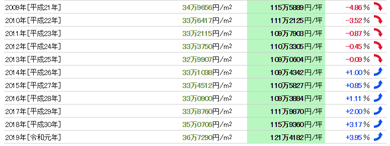 從1983年(昭和58年)開始37年的數據,公示地價的最高值是80萬5052日元/㎡(1991年),最低價格是30萬1214日元/㎡(1983年),兩者的差異是2.77倍。基準地價的最高值是92萬3928日元/㎡(1991年),最低價格是30萬3476日元/㎡(2005年),兩者的差異是3.04倍。