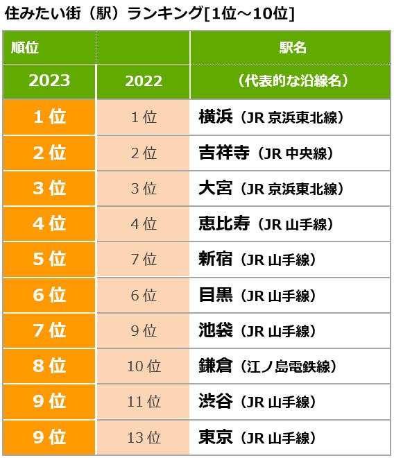 首先,我們來介紹一下2023年想居住的車站排名結果: "橫濱"奪得第一名、"吉祥寺"保持第二名,去年位列第三的"大宮"保持原位置,"惠比壽"堅守第四名、TOP4和2022年一樣。