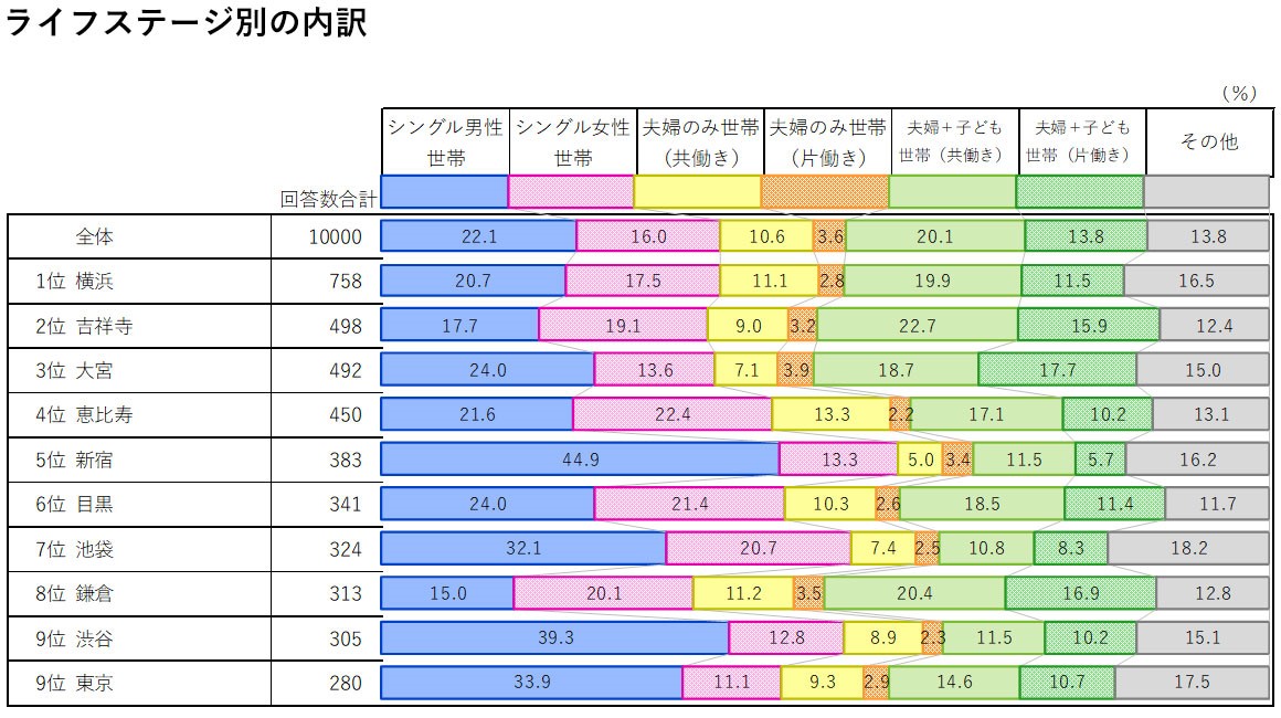接下來,讓我們關注一下「新宿」。它在2023年取得了顯著的進步,躋身進了前五名,而推動其進步的原動力是「單身男性」。從生活階段的分析來看,在投票給新宿的人中,單身男性占44.9%。與第一名的橫濱22.1%、第二名的吉祥寺20.7%和第三名的大宮24.0%相比,新宿單身男性的份額顯著高出許多。