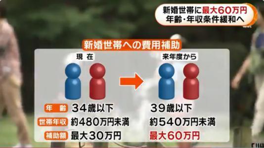 在日本政府剛剛提高了治療不孕不育證的補(bǔ)貼之后,又推出了新婚生活補(bǔ)貼政策,每對(duì)新人最高可申請(qǐng)60萬日元(約4萬人民幣)的補(bǔ)助金。這筆錢可以用作租房結(jié)婚的房屋押金、搬家費(fèi)等,有人戲稱“政府都把婚房準(zhǔn)備好了,還不結(jié)婚嗎”?不過申請(qǐng)這一補(bǔ)貼需要有一定的前提條件,按著現(xiàn)在的規(guī)定,從2021年開始在實(shí)施新婚生活支援項(xiàng)目的市區(qū)町村,新婚夫婦結(jié)婚當(dāng)日的年齡都小于39歲,且家庭年收入少于540萬日元即可申請(qǐng)。