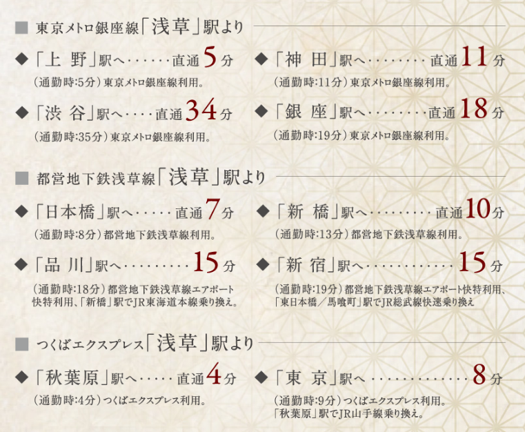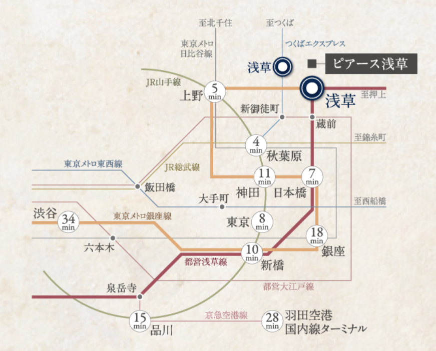 PIAS淺草高級公寓的交通十分便利,距銀座線“淺草”站步行8分鐘、東武伊勢崎線“淺草”站步行7分鐘、都營淺草線筑波快車“淺草”站步行10分鐘。銀座線淺草站為始發站,是上班族理想的始發車站居住地。乘電鐵到東京站8分鐘,銀座站18分鐘、秋葉原4分鐘、羽田機場28分鐘、成田機場70分鐘等等,很容易到達城市各個地方。隨著東京城市交通網的不斷完善,規劃中的線路將來可接駁JR山手線的新站“高輪網關”站,乘坐京急線,也可以直達2027年開通的磁懸浮中央新干線的始發站“品川”,未來預期前途無量。