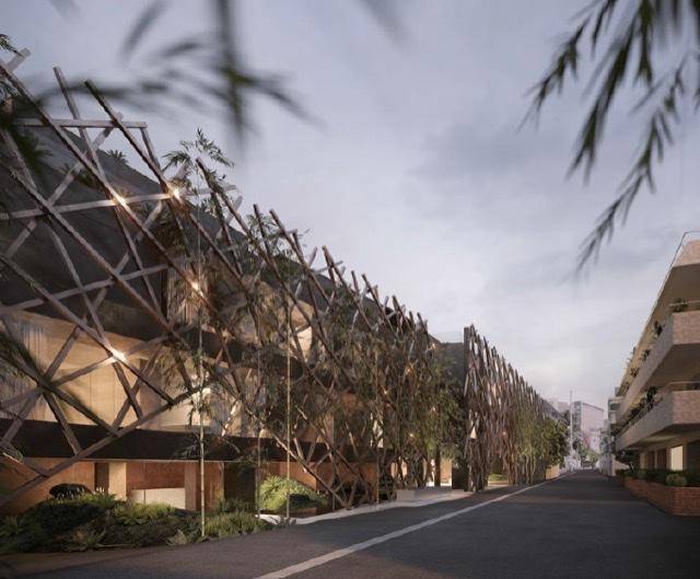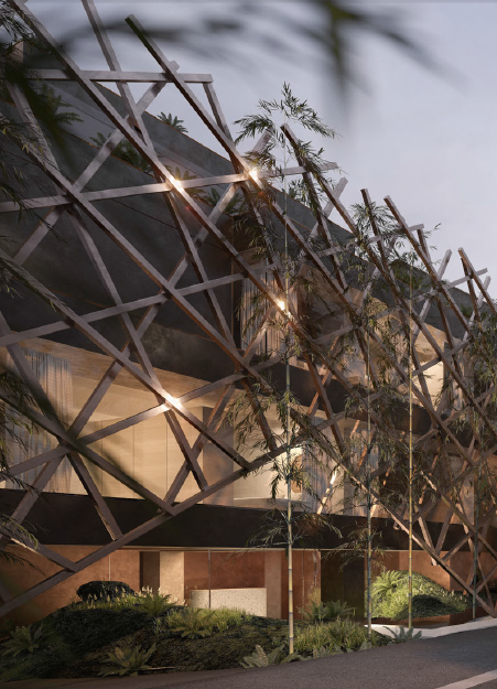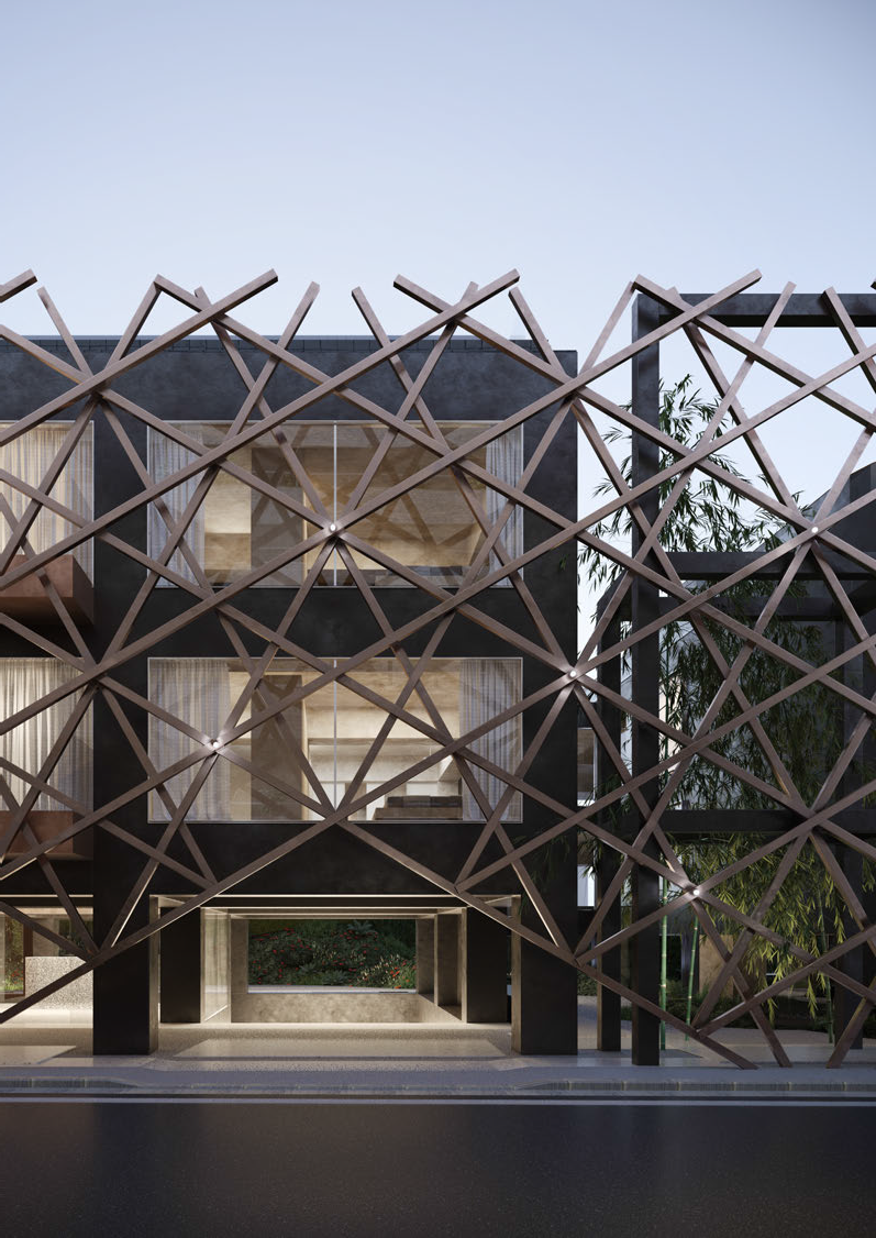 項目保留了中庭的園林景觀,為了與庭院相呼應,整個建筑的外圍使用了日本竹子和格子的元素,從外觀就可以感覺到大自然包裹著整個建筑,仿佛逃離了城市的喧囂,生活在大自然之中,并融入其間的美好。有人說青山雅筑遠看像中國的鳥巢一樣,外觀大氣、新穎,近看又如蠶繭一般,細膩、藝術。