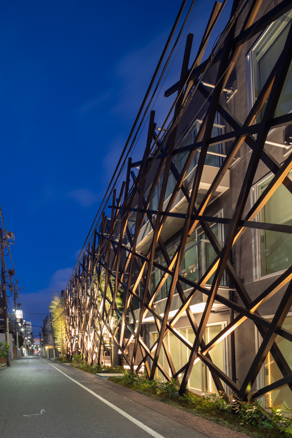 和普通的建筑只是部分使用格子元素有所不同,青山雅筑的建筑外觀大面積地使用了交錯的格柵,將建筑本體與外面的道路之間隔離出來一條內部便道,且使兩棟建筑融為一體,毫無違和感,從整體外觀看起來更是形成了統一的連續感。格柵外還種植了翠竹,竹子也是日本建筑的傳統元素,竹葉隨風舞動,與靜態的格柵動靜相宜。同時建筑的墻壁也大面積地使用了落地玻璃,格柵與竹子在日光的照應下,投影在玻璃幕墻更具有幻影感,虛實結合更呈現出夢幻的光影效果。