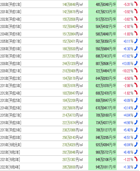 自1983年(昭和58年)以來的40年中,公示地價的最高價為每平方米7239.736萬日元(1991年),最低價為每平方米123.6836萬日元(1983年),兩者的差異是5.85倍?;鶞实貎r的最高價為每平方米8058.006萬日元(1990年),最低價為每平方米126.5747萬日元(1983年),兩者的差異是6.37倍。