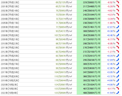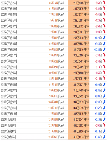 從1983年(昭和58年)開始的40年數據中,公示地價的最高值為每平方米273萬5360日元(1991年),最低值為每平方米54萬7383日元(1983年),兩者的落差為5.00倍。基準地價的最高值為每平方米386萬4123日元(1988年),最低值為每平方米59萬4797日元(1983年),兩者的落差為6.50倍。