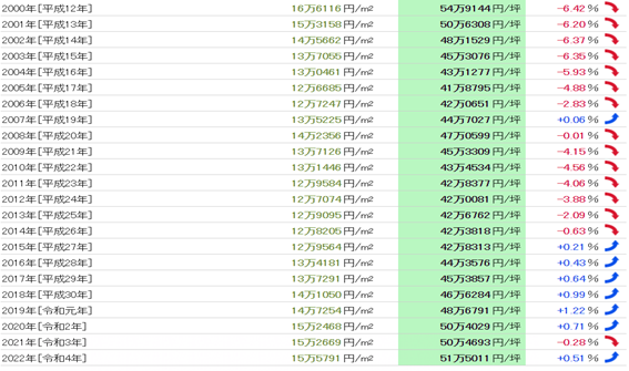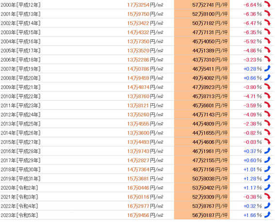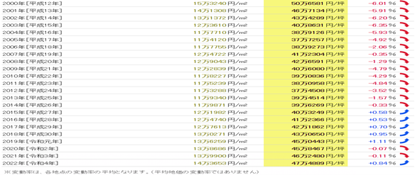 從1983年(昭和58年)開始共40年的數據來看,公示地價的最高值是每平方米39,331日元(1991年),最低值是每平方米13,286日元(2006年),兩者之間的差異是3.02倍。基準地價的最高值是每平方米36,8325日元(1991年),最低值是每平方米11,3288日元(2012年),兩者之間的差異是3.25倍。