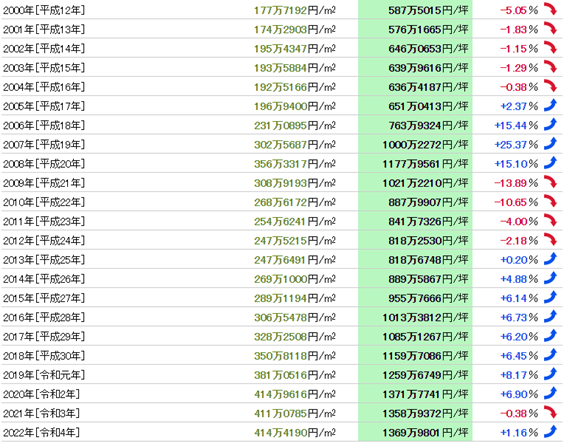 在實際進(jìn)行的不動產(chǎn)交易價格(由國土交通省發(fā)布)中,我們僅篩選出不包含建筑物(如大樓、房屋)的土地交易,并計算出平均價格。這些交易的價格是實際進(jìn)行的不動產(chǎn)交易價格,因此可以近似地反映市場價格。在2022年(令和4年)第1季度,港區(qū)的土地交易價格為每平方米225.4萬日元,每坪7451.24萬日元,同比下降39.77%。這個平均交易價格與上述公示地價和基準(zhǔn)地價的平均數(shù)相比,差距為-45.61%。