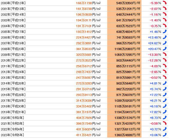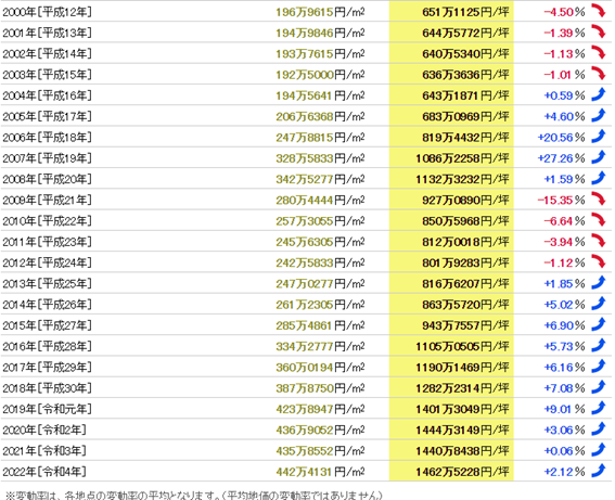 這個頁面所列出的東京都港區(qū)土地市場價格是基于公示地價和基準(zhǔn)地價的標(biāo)準(zhǔn)土地和基準(zhǔn)數(shù)據(jù),并由我們自行匯總平均值并計算波動率,然后將港區(qū)在日本全國市鎮(zhèn)中的排名列出。