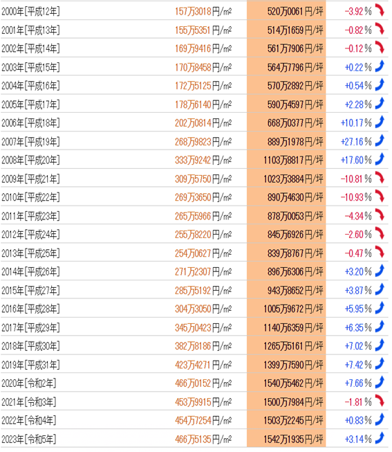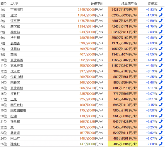 這個頁面所列出的東京都港區土地市場價格是基于公示地價和基準地價的標準土地和基準數據,并由我們自行匯總平均值并計算波動率,然后將澀谷區在日本全國市鎮中的排名列出。