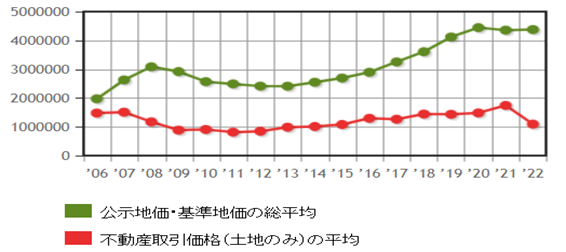 在實際進行的不動產交易價格(由國土交通省發布)中,我們僅篩選出不包含建筑物(如大樓、房屋)的土地交易,并計算出平均價格。這些交易的價格是實際進行的不動產交易價格,因此可以近似地反映市場價格。在2022年(令和4年)第1季度,澀谷區的土地交易價格為每平方米110萬7500日元,每坪366萬1157日元,同比下降36.97%。這個平均交易價格與上述公示地價和基準地價的平均數相比,差距為-74.78%。