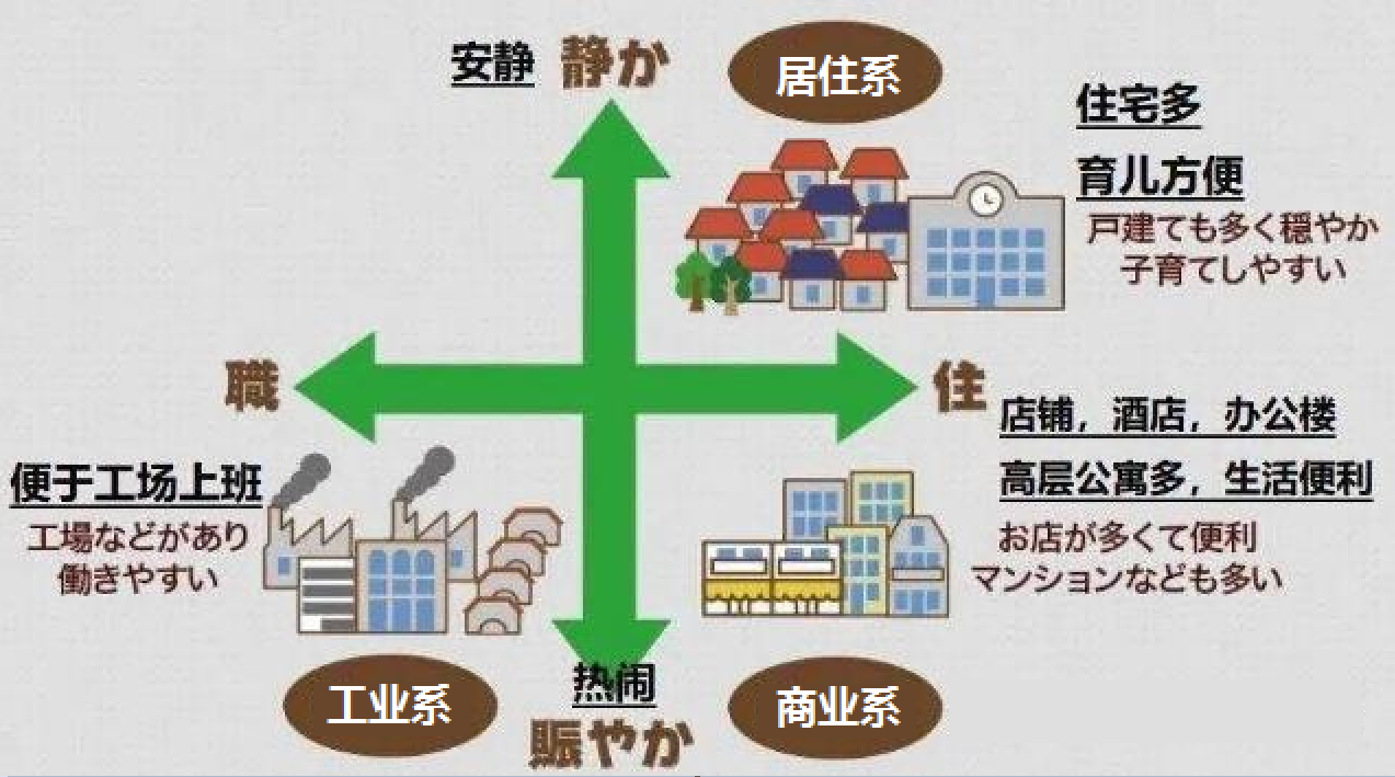 住宅類用地包括:第一種低層住宅專用地域、第二種低層住宅專用地域、第一種中高層居住專用地域、第二種中高層居住專用地域、第一種居住地域、第二種居住地域、準居住地域、田園居住地域;