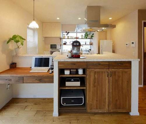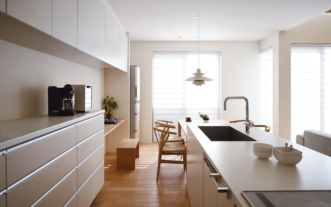 日本現(xiàn)代起居室的設(shè)計(jì),一般為I型或者L型,特別是I型的起居室,廚房為開放式的,和餐廳、客廳連為一體,戶型規(guī)矩,給人的視覺效果就會(huì)顯得面積很開闊、敞亮。這樣的設(shè)計(jì)總會(huì)讓有限的面積被充分的利用,不會(huì)有過多的隔斷而影響使用空間。現(xiàn)在開放式的廚房,一般也會(huì)配備大功率的抽油煙機(jī)、灶臺(tái)、烤箱、洗碗機(jī)以及超大的水槽和櫥柜,這樣做的好處是功能比較齊全,合理利用收納空間。而且大水槽和臺(tái)面也讓多數(shù)的廚房工作集中在這里完成,可以節(jié)省其他的置物空間。有的廚房還會(huì)專門留出放冰箱的位置,這樣會(huì)讓人感覺冰箱隱藏在墻壁里,從而避免障礙感。另外,有的廚房還注重放置收納的臺(tái)面,這樣電飯煲、微波爐等廚房設(shè)備可以依次擺放,最大限度地節(jié)省空間,也讓廚房看起來(lái)井井有條,而實(shí)際使用面積也許會(huì)比封閉式的廚房更小且使用更方便。