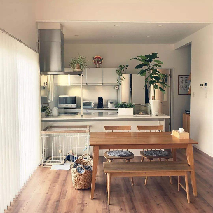 在設(shè)計(jì)上,日本人更注重細(xì)節(jié)。所以客廳雖然與餐廳面積連在一起,但是相互之間的比例和尺寸把握得當(dāng),這樣也不會(huì)讓人覺得餐廳和廚房的空間使用過多,反而讓客廳空間顯小,感覺壓抑。也正是因?yàn)楸壤齾f(xié)調(diào),才會(huì)讓人覺得客廳更加霍亮,廚房和餐廳的功能也完全不受影響。餐、客、廚三個(gè)空間,無(wú)論從視覺感還是從使用感受上來(lái)說(shuō),都是相互映襯相輔相成的。