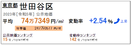 2023年(令和5年)發布的最新公示地價顯示,東京都世田谷區的地價為平均每平方米74萬7349日元,平均每坪地價為247萬0577日元,坪價格日本全國排名第15位。地價較去年上漲2.54%,在日本全國變動率排名第142位。