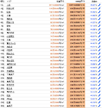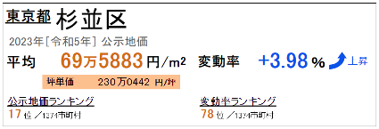 我能發布的東京都杉并區土地價格的市場行情,并基于公示地價和基準地價的標準地/基準地數據,由我們獨立計算平均值和變動率,并按照東京都杉并區在全日本市區町村中的排名進行統計。