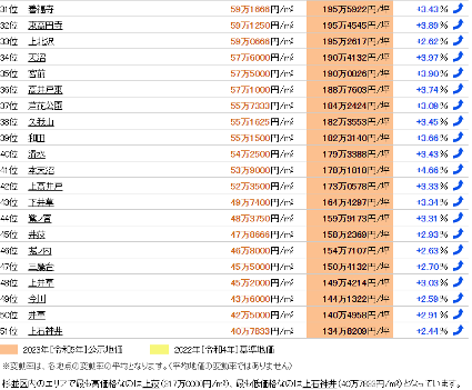 杉并區的最高價地點是「杉並區上荻1-8-9」(每平米317萬日元),最低價地點是「杉並區井草5-12-14」(每平米42萬2000日元)。