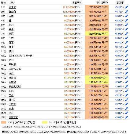 我們發布的東京都墨田區土地價格的市場行情,是基于公示地價和基準地價的標準地/基準地數據,由我們獨立計算平均值和變動率,并按照東京都墨田區在全日本市區町村中的排名進行統計。