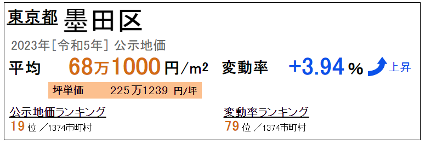 2023年(令和5年)發布的最新公示地價顯示,東京都墨田區的平均地價為每平方米68萬1000日元,每坪地價平均為225萬1239日元,坪價格日本全國排名第19位。地價較去年上漲3.94%,在日本全國變動率排名第79位。