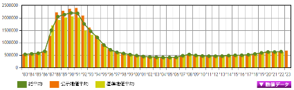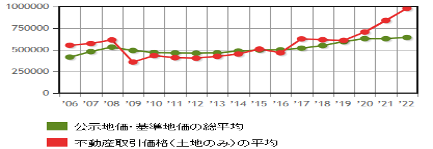 在實際進行的墨田區房地產交易中,日本國土交通省僅計算了不包括建筑物(例如大樓或房屋)的土地銷售交易的平均價格。由于這些是來自實際房地產交易的價格,因此它們是更加接近市場價格的數字。在2022年(令和4年)第一季度中,墨田區的土地交易價格按每平方米計算為98萬日元/平方米,按每坪計算為323萬9669日元/坪,與去年相比上漲了+16.65%。這個平均交易價格與公示地價和基準地價的平均值相比,有一個+52.36%的差距。