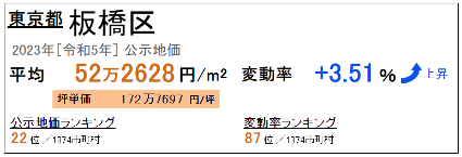 2023年(令和5年)發布的最新公示地價顯示,東京都板橋區的地價為平均每平方米52萬2628日元,每坪地價平均為172萬7697日元,坪價格日本全國排名第22位。地價較去年上漲3.51%,在日本全國變動率排名第87位。