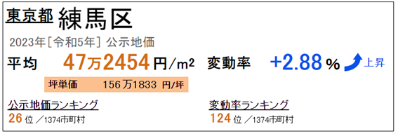 2023年(令和5年)發布的最新公示地價顯示,東京都練馬區的地價為平均每平方米47萬2454日元,平均每坪地價為156萬1833日元,坪價格日本全國排名第26位。地價較去年上漲2.88%,在日本全國變動率排名第124位。