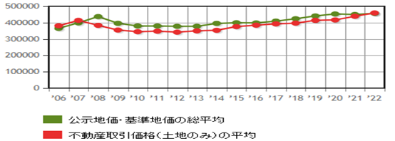 在實際進行的練馬區房地產交易中,日本國土交通省僅計算了不包括建筑物(例如大樓或房屋)的土地銷售交易的平均價格。由于這些是來自實際房地產交易的價格,因此它們是更加接近市場價格的數字。在2022年(令和4年)第一季度中,練馬區的土地交易價格按每平方米計算為45萬9230日元/平方米,按每坪計算為151萬8118日元/坪,與去年相比上漲了+4.62%。這個平均交易價格與公示地價和基準地價的平均值相比,有一個+0.51%的差距。