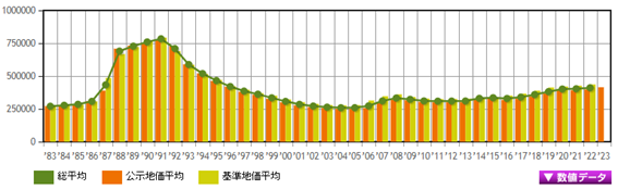 在實際進行的足立區房地產交易中,日本國土交通省僅計算了不包括建筑物(例如大樓或房屋)的土地銷售交易的平均價格。由于這些是來自實際房地產交易的價格,因此它們是接近市場價格的數字。在2022年(令和4年)第一季度中,足立區的土地交易價格按每平方米計算為46萬6111日元/平方米,按每坪計算為154萬0863日元/坪,與去年相比上漲了+30.85%。這個平均交易價格與公示地價和基準地價的平均值相比,有一個+13.46%的差距。