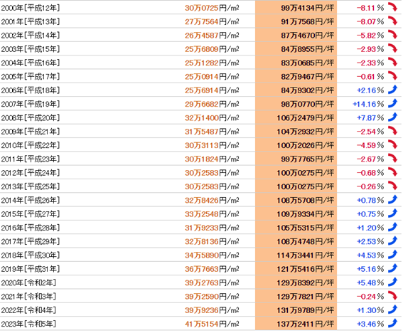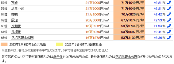 我們發布的東京都足立區土地價格的市場行情,是基于公示地價和基準地價的標準地/基準地數據,由我們獨立計算平均值和變動率,并按照東京都足立區在全日本市區町村中的排名進行統計。