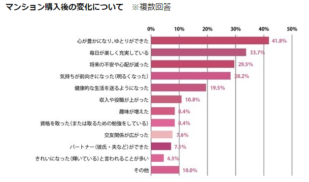 此外,已經購買了公寓的單身女性們的心境也會隨之變得更積極,感覺生活寬裕了,結婚的比例也增加了,升職和漲薪幅度也增加較大。