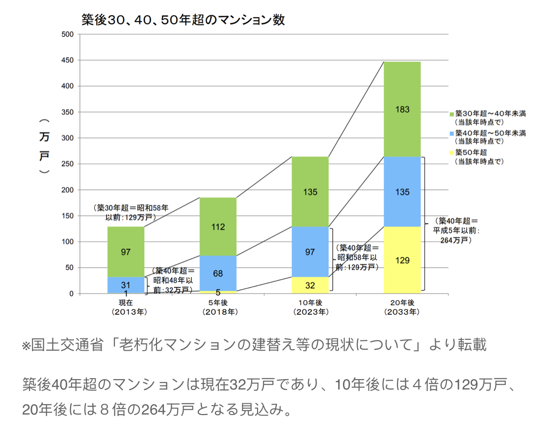 日本是地震頻國家,所以考慮日本建筑物壽命的時(shí)候,就不能不提建筑物的耐震性能。具體來說,日本以1981年為界限,把建筑物分為舊抗震基準(zhǔn)和新抗震基準(zhǔn)(壁式施工法除外)。1981年以前的公寓,由于混凝土的性能與鋼筋的量、施工方法等不同,物件的耐震性能不如現(xiàn)行標(biāo)準(zhǔn)的建筑物。這種舊耐震基準(zhǔn)的公寓即使進(jìn)行了耐震修復(fù)工程,也不能確保與現(xiàn)行的抗震基準(zhǔn)有同等的抗震性,但是單純從防止物件徹底倒塌的角度上看,具有一定的效果。如下圖所示,預(yù)計(jì)2018年建造30年以上的公寓為185萬戶。其中舊耐震標(biāo)準(zhǔn)的公寓被推測為100萬戶,有多少公寓正在進(jìn)行抗震改建,尚不清楚。但是1981年以前建的舊耐震高級公寓中,也有抗震性強(qiáng)的公寓。