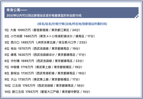 今天,我們就以面積在20~40平米的單身公寓為對象,向大家介紹一下步行15分鐘可以到達車站,并且乘坐電車在30分鐘內可以到達新宿站,二手房價格較低的車站前10名排行。